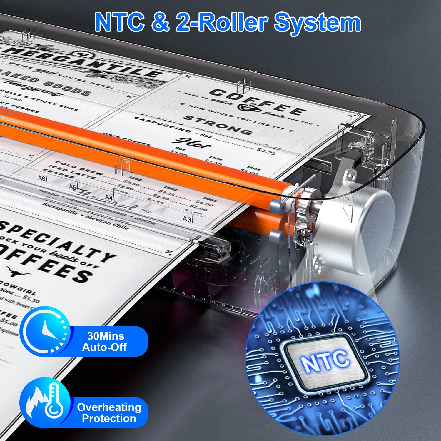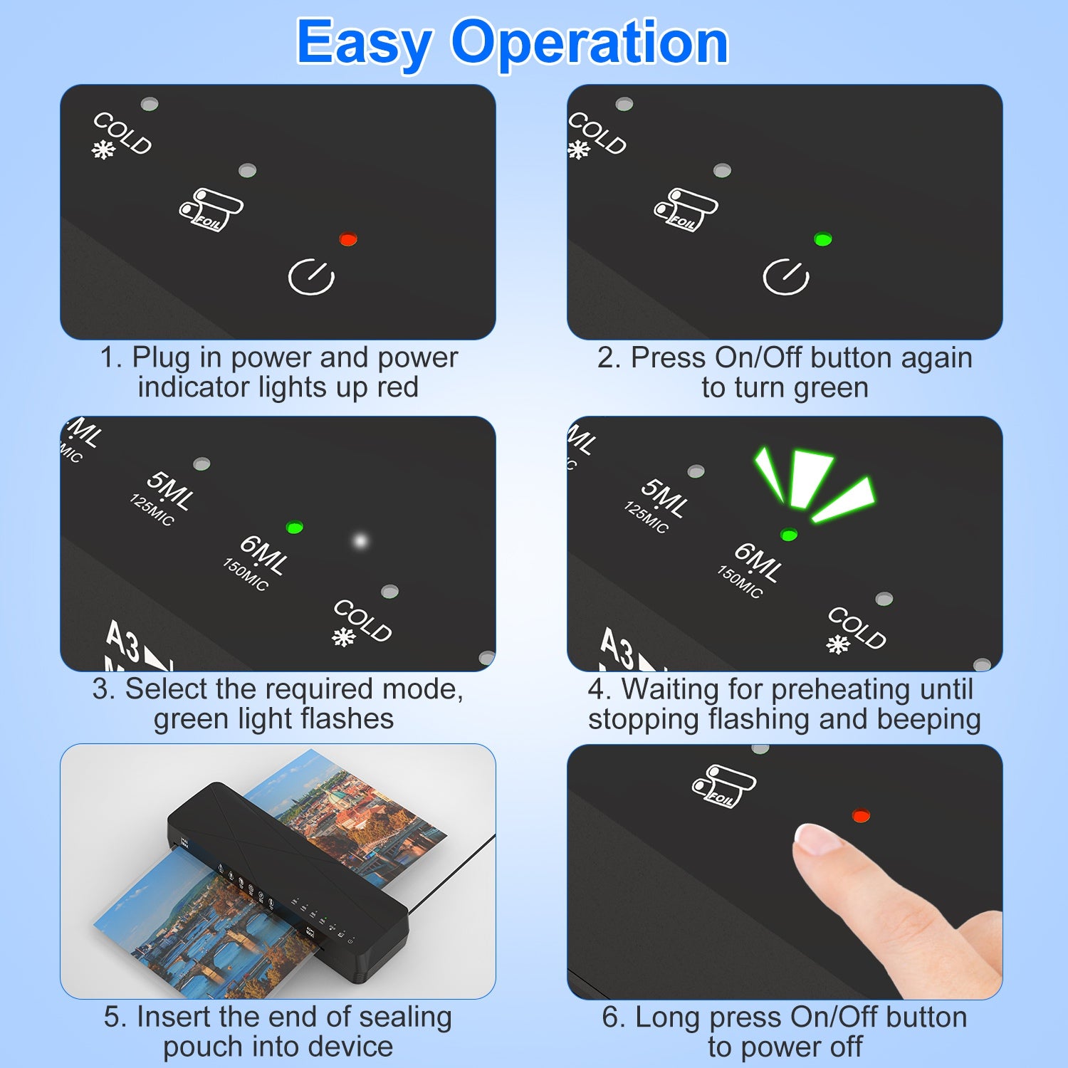 - *Safe & Easy Operation*: Featured with 2-roller system with intelligent temperature control,offer even heat and precise pressure for lamination. No complicated operation,simply touch button to adjust laminating modes or turn on/off power. Additionally,overheating protection and 30mins auto-off protection effectively prolong the lifespan of our laminator machine.