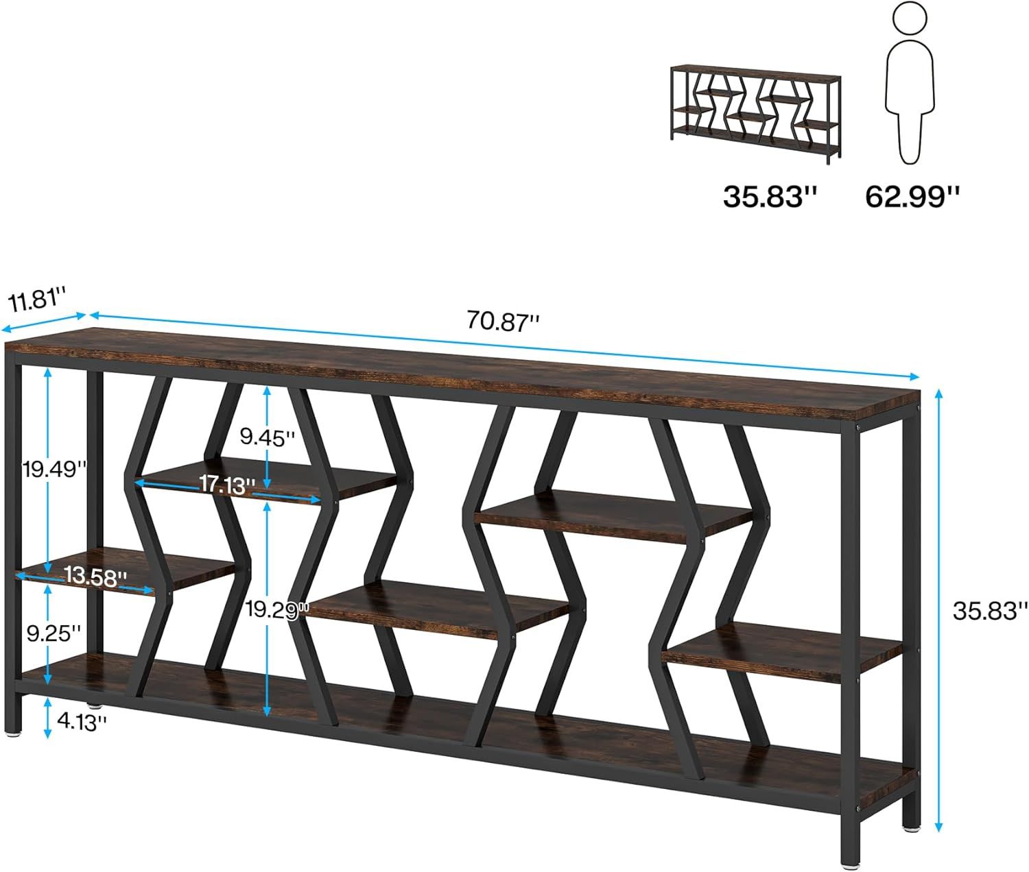 Ample Storage Space: With its 4 tiers of open shelves and a 70.9" long tabletop, this sofa table provides ample storage space for all your needs. It is specifically designed to be placed behind couches or against walls, making it a great space-saving solution for smaller living spaces. Whether you need a place to display decorations or store books and other items, our sofa table has got you covered