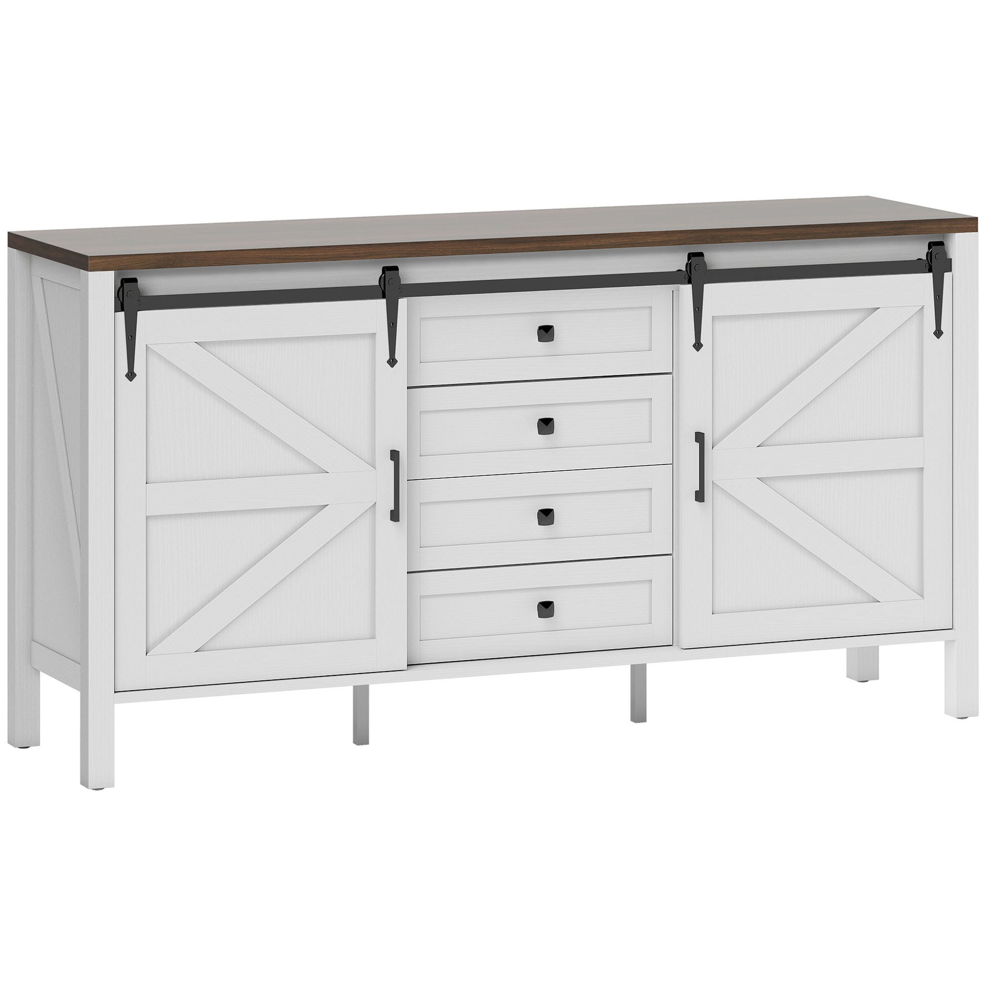 59 Buffet Cabinet, Farmhouse Sideboard With Thick Top, 2 Barn Doors, 4 Drawers And 2 Adjustable Shelves, White