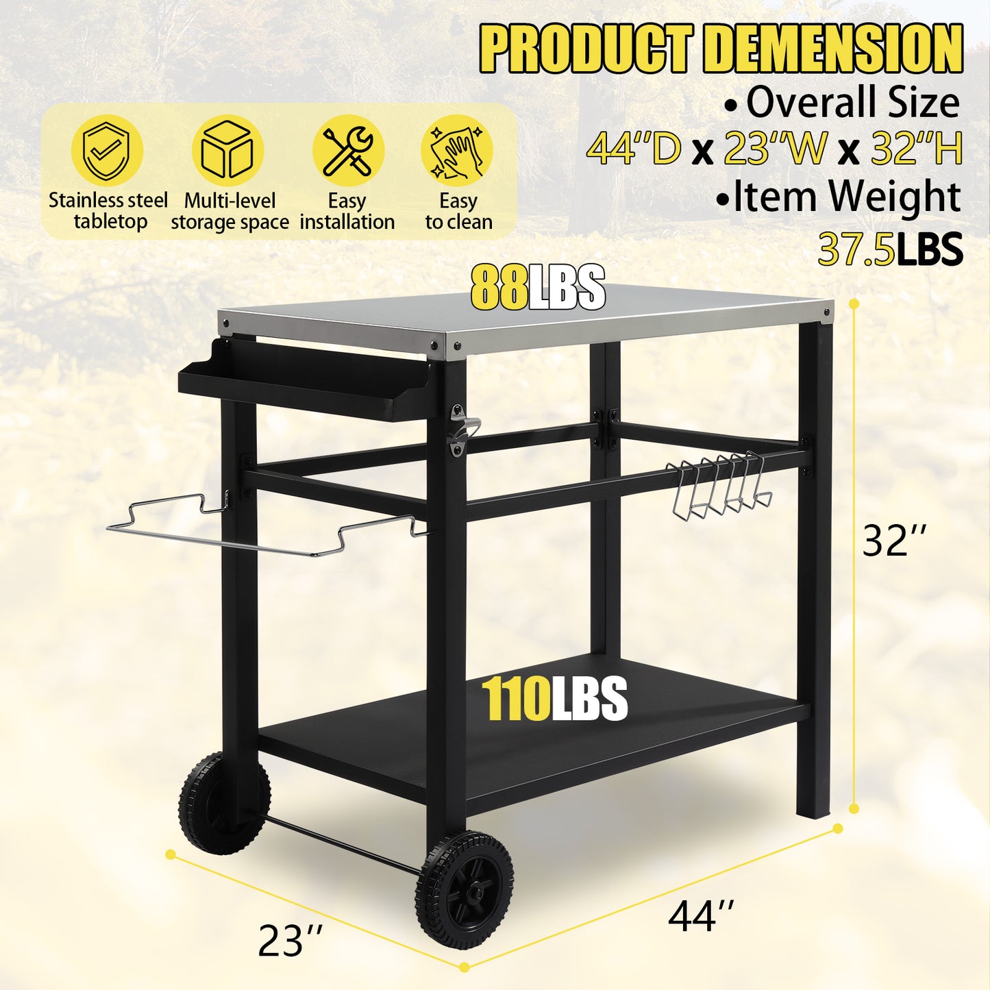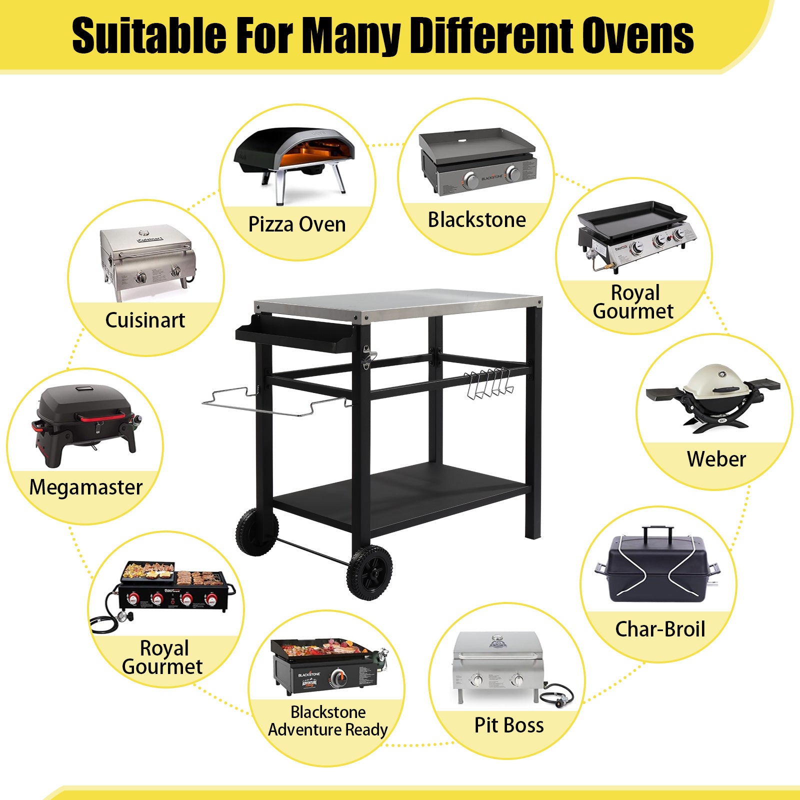 4. Easy Mobility: With two durable wheels and a sturdy handle, this cart can be easily moved around your outdoor space, making it adaptable for any cooking scenario.