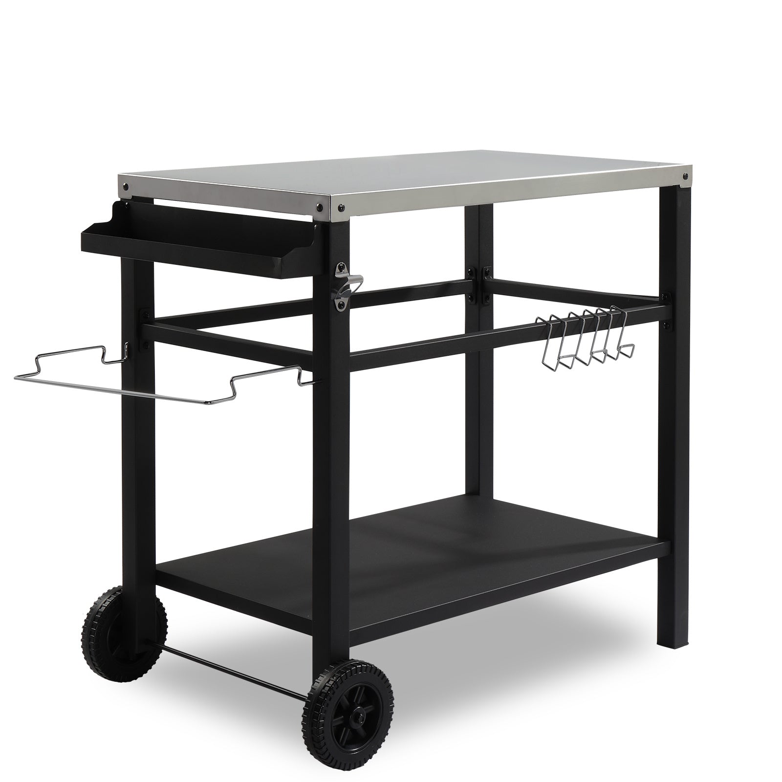 Kick off your outdoor cooking experience with our Multifunctional Grill Cart. This cart is specifically designed for the outdoor chef, enhancing your grilling, prepping, and serving experience. With a body made of iron and a 430 stainless steel tabletop, this cart ensures both robustness and durability. The upper and lower shelves provide ample storage for all types of food, utensils, and other tools. Equipped with various accessories like spice rack, garbage bag hook, tissue hook, and beer opener, it brings orderliness to your grilling station. With a comfortable grip handle and two wheels, the cart is conveniently movable. This versatile cart can be used as an outdoor prep table for grill, food serving table, bar cart, BBQ grilling table, outdoor grill station, and more.