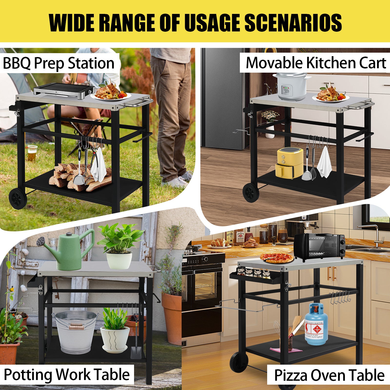 5. Versatile Use: The cart can be used as an outdoor prep table, a food serving table, a bar cart, a BBQ grilling table, and more, offering multifunctional convenience for your outdoor cooking needs.