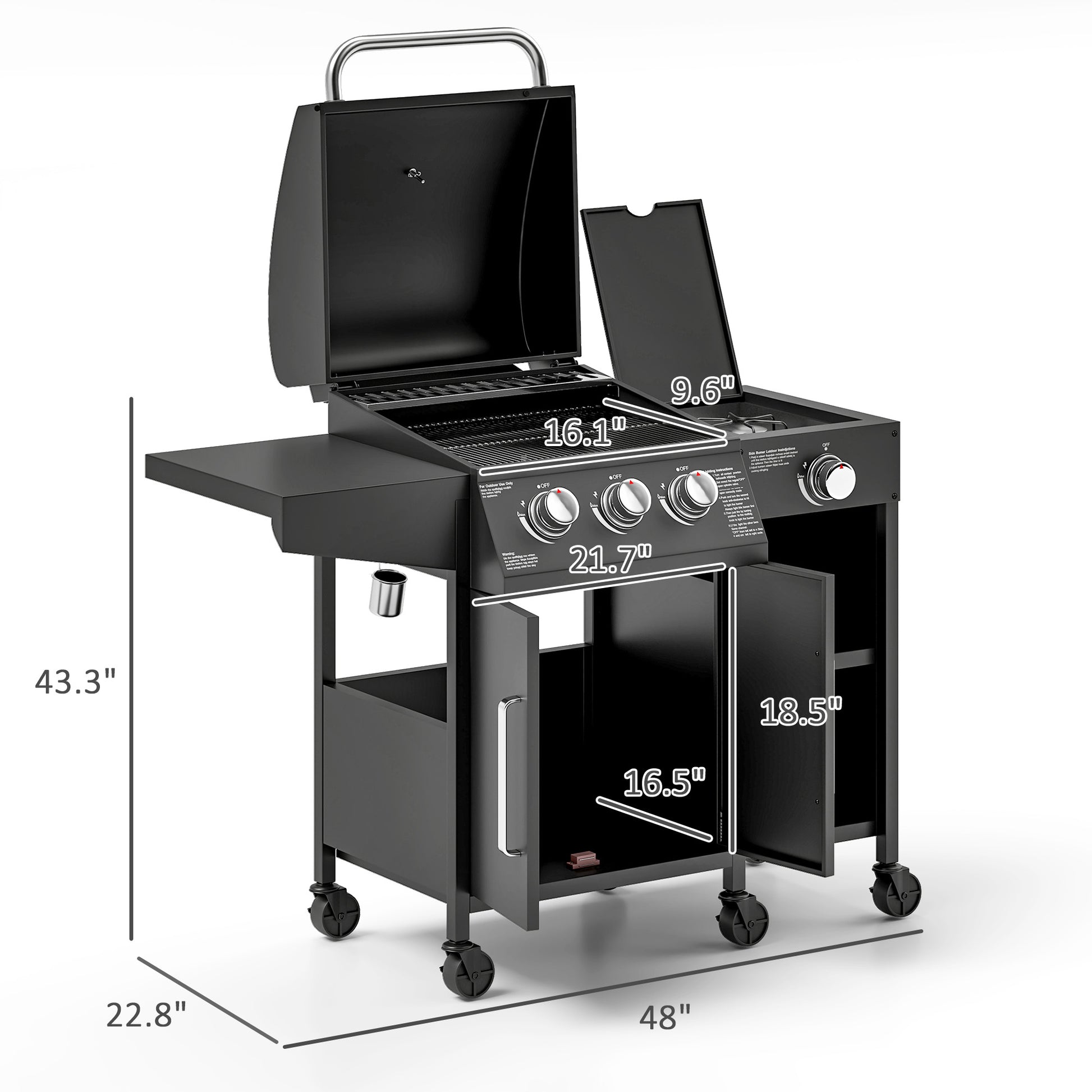 - - Cabinet Inner: 21.7" W x 16.5" D x 18.5" H, for 20 lbs. cylinder