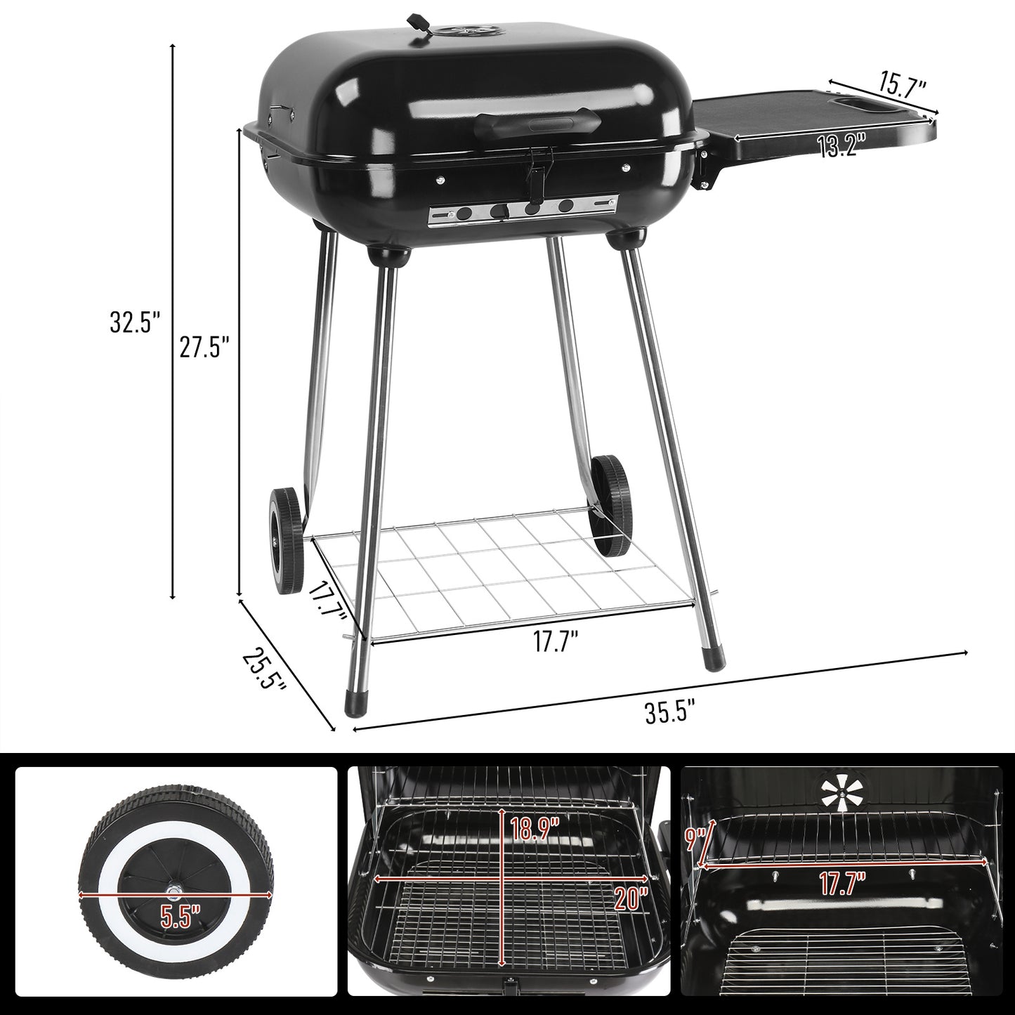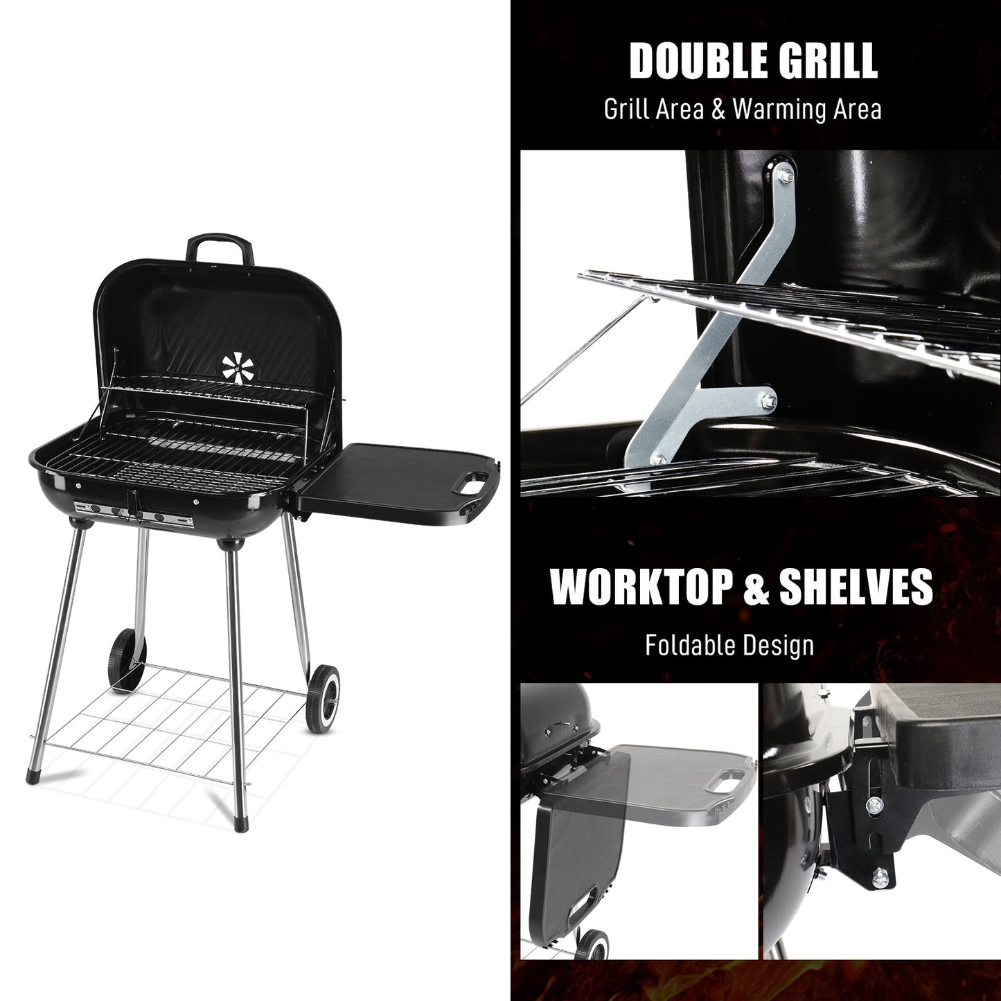 89.5x65x83cm Black, Foldable Side Panels, Square, Charcoal Grill