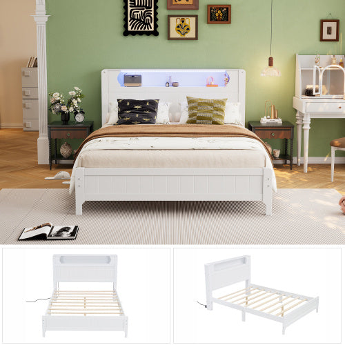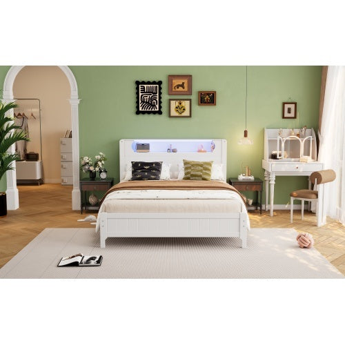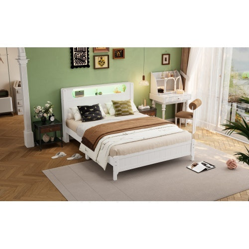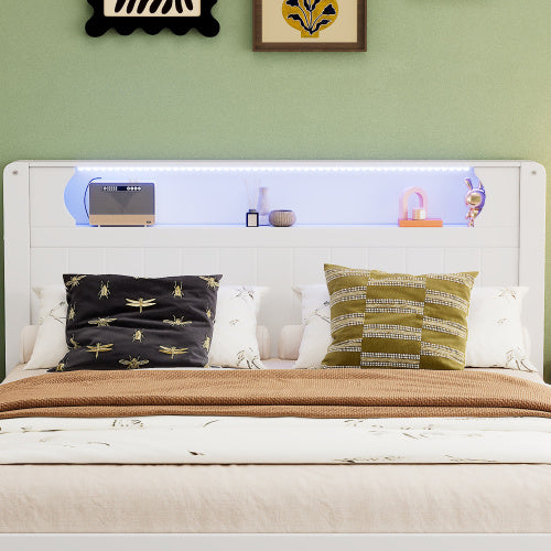 Doppelbett, Offenes Regal, Mit Umgebungslichtstreifen, Flachbetten, Holzbetten,Kiefer+MDF, Weiß