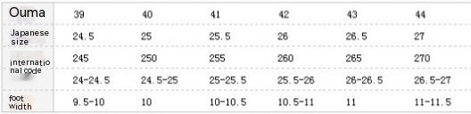 | Foot Length(mm) | 225 | 230 | 235 | 240 | 245 | 250 | 255 | 260 | 265 | 270 |