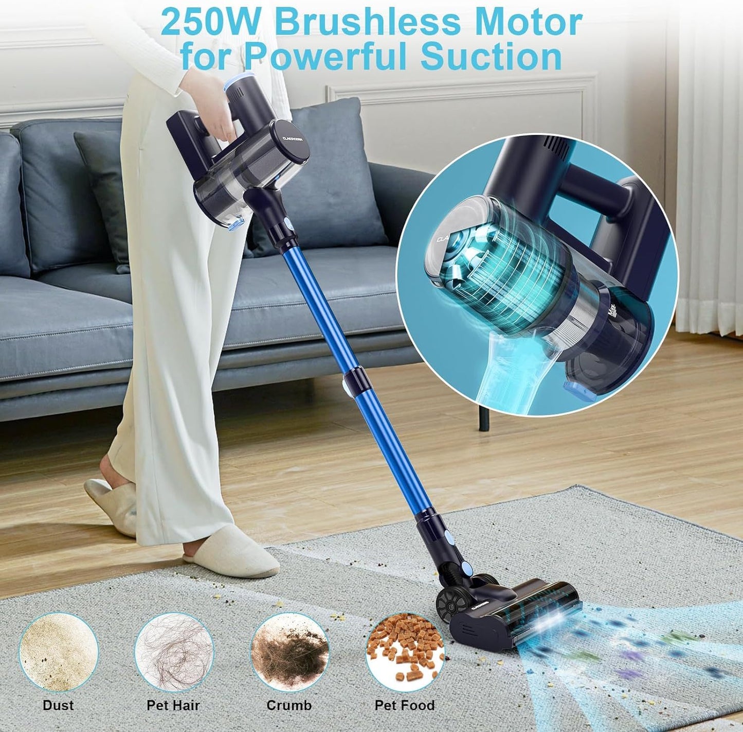- 【Powerful Suction】: The cordless vacuum cleaner with 250W upgraded motor,strong suction on max mode, it can instantly capture debris, dust, crumbs, pet hair, cat litter,and other messes with ease.