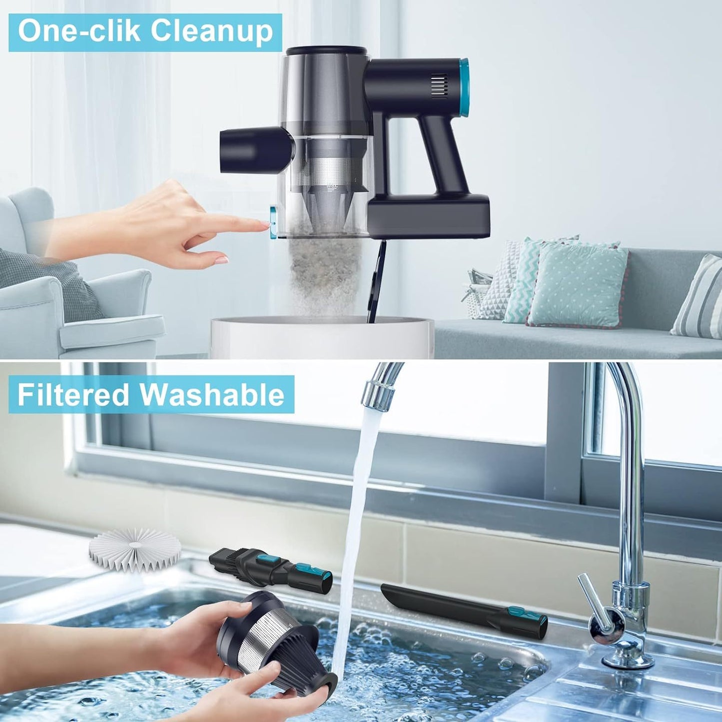 - 【High-efficiency Filtration System】: The vacuum cleaner with all-new cyclone technology and high-density meshing, multi cone filtration can efficiently capture 99.99% of the microscopic dust particles as small as 0.2 microns to avoid secondary pollution. So this rechargeable vacuum provides the purified air for your families.