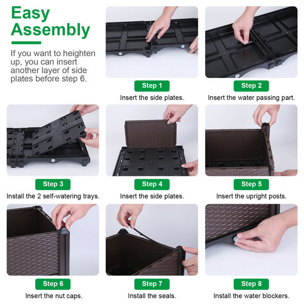 - Easy Assembly: Easy to assemble. Attach the self-watering tray to the base plate, install the side plates, insert the upright posts, then install the nut caps and water blockers.