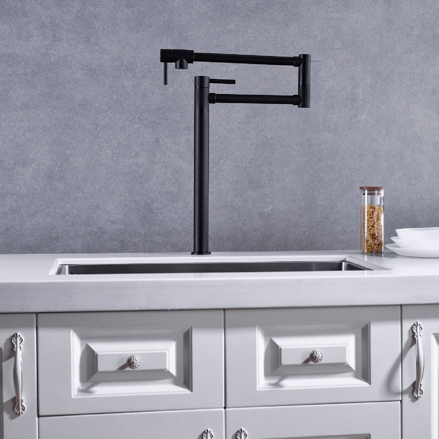 The stylish Modern Two Handle Dual Joint Kitchen Pot Filler will instantly upgrade your kitchen. Its contemporary design combines form and all-in-one function in a sleek modern package. The faucet's retractable arm is the perfect height to quickly fill pots on a countertop or in the sink. Comfortable ergonomic design with two on-off handles for easy control and operation. Both swivel joints rotate 360° and supply a full range of water access. The brushed nickel finish is beautiful and simple to keep clean and stain-free. Brass construction with superior stain resistance requires minimal maintenance. Space saving modern design folds when not in use. Single hole set up for easy installation