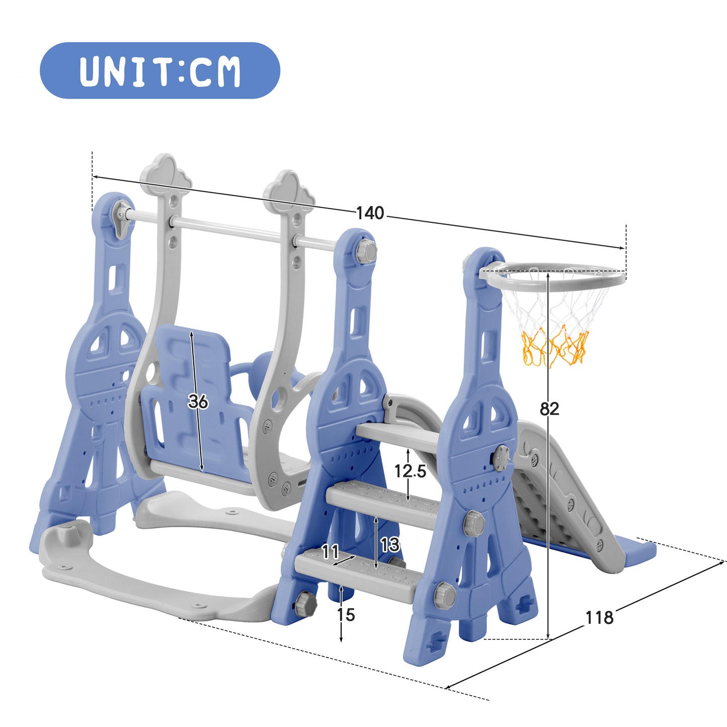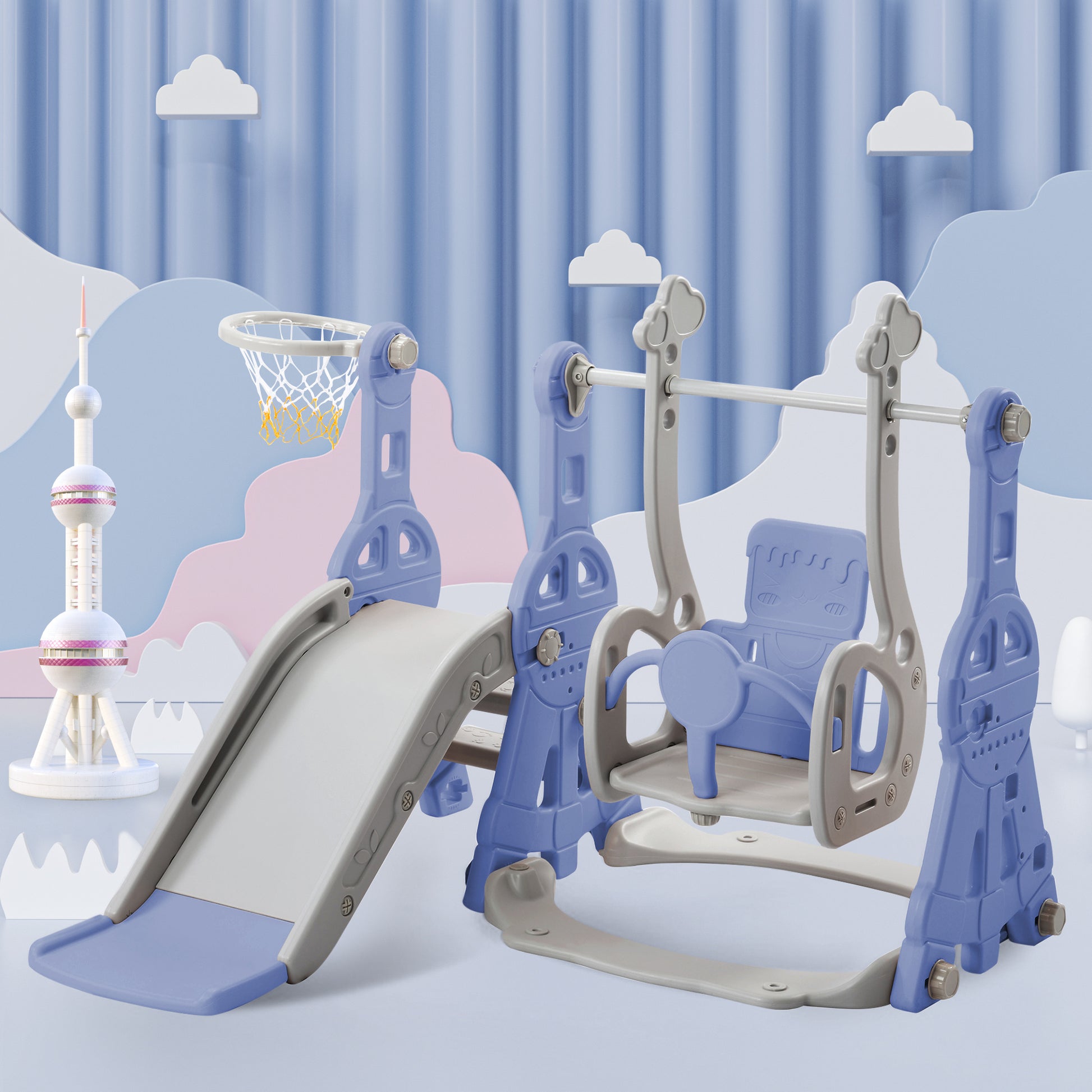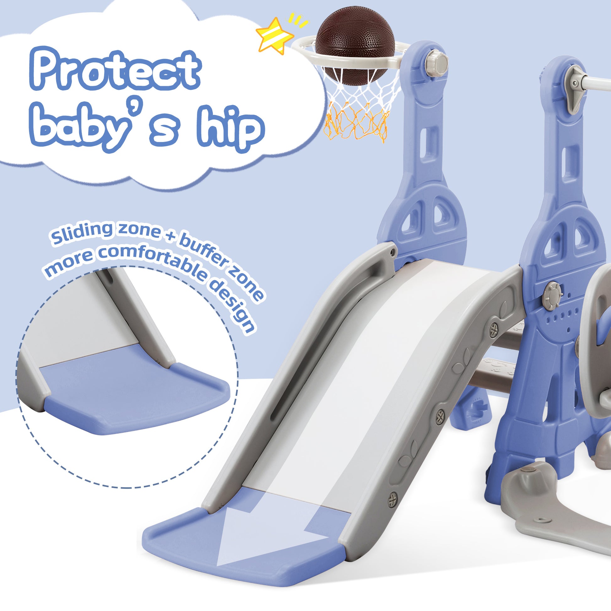 Safety Design There are three layers of ladder with texture can ensure children's safety, as it is easy to climb and won't let your children slip. An extended part is designed at the bottom of the slide as a buffer area, which can effectively reduce the sliding speed and provide the best support for the child's spine and hips. The T-shaped safety guard of the swing secures your kid to the swing for safety. Notable Details The children's playground uses premium HDPE, which has passed the EN71 series certification. It's odorless and strong. The surfaces of this multifunctional children's playground are smooth and the edges are mellow and full, that can avoid any hurt during the playing. The bottom of this product can be filled with water, which further enhances the stability in use. Humanized Configuration This 4-in-1 children's playground will be shipped with air pump and matching basketball. Users can enjoy all the features once they have assembled them after receiving. Humanized Configuration This 4-in-1 children's playground will be shipped with air pump and matching basketball. Users can enjoy all the features once they have assembled them after receiving. The logical user's manual assist users assemble this children's playground in right steps. The swing height of the toy is adjustable to suit babies of different heights. Easy Maintenance & Use This multifunctional children's playground contains no metal parts, and all parts can be connected with plastic nuts. In that case, users can install this product easily without tools. This product can be used both indoors and outdoors due to surface waterproofing. So, this product is suitable for both lobby and backyard. Daily maintenance can only be wiped with a wet cloth.