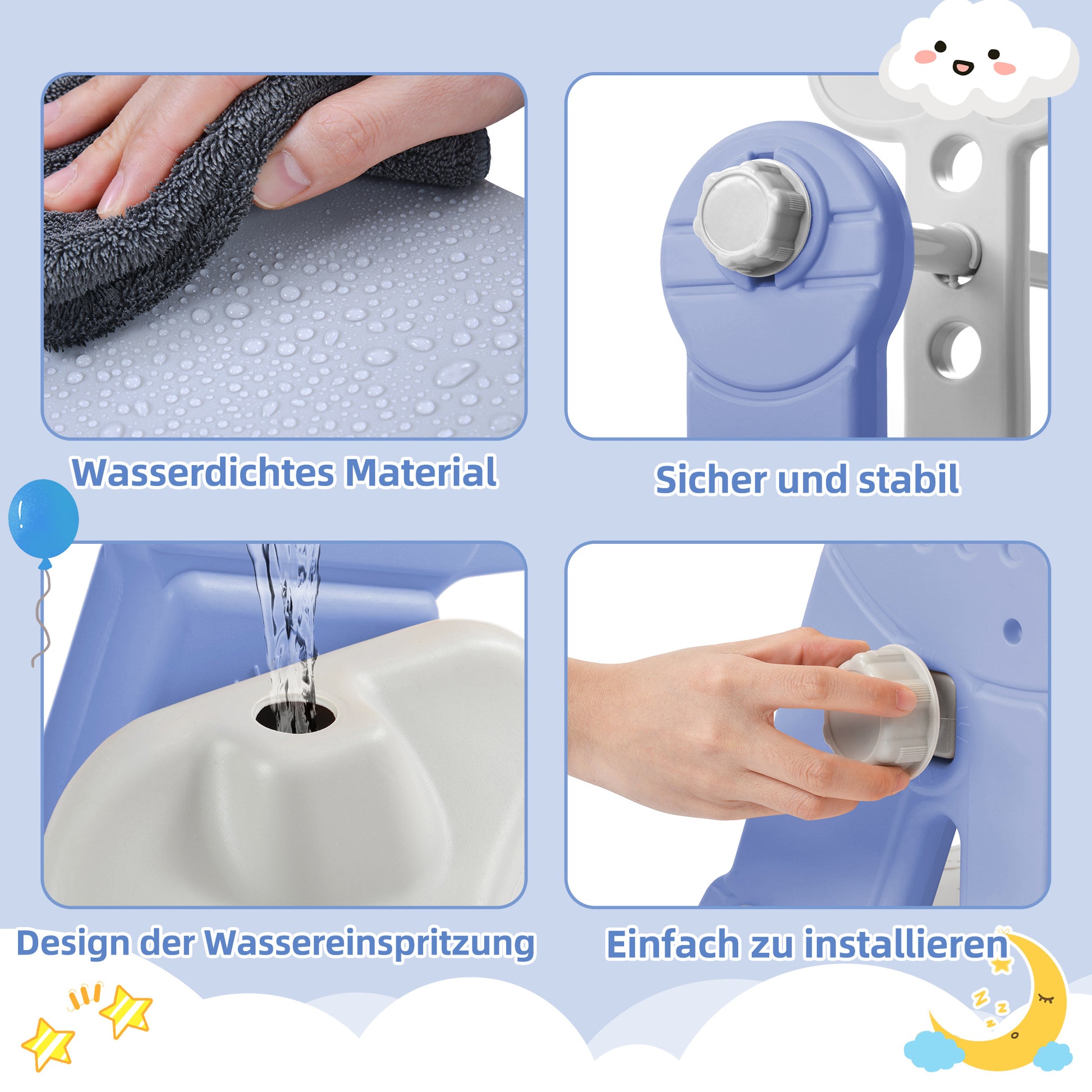4-in-1-Multifunktionsstil Benötigen Sie nur diesen 4-in-1 Kinderspielplatz, können Ihre Kinder den vielfältigen Spiel- und Sportmöglichkeiten gerecht werden, denn dieser multifunktionale Spielturm inklusive Rutsche, Leiter, Schaukel und Basketballkorb. Kairnder können beim Spielen ihre Muskeln, Kraft und Hand-Auge-Koordination trainieren. Sicherheitsdesign Es gibt drei Leiterschichten mit Textur, die die Sicherheit von Kindern gewährleisten können, da sie leicht zu besteigen sind und Ihre Kinder nicht ausrutschen lassen. Am unteren Ende der Rutsche ist ein verlängerter Teil als Pufferbereich konzipiert, der die Rutschgeschwindigkeit effektiv reduzieren und die Wirbelsäule und Hüfte des Kindes optimal stützen kann. Der T-förmige Sicherheitsschutz der Schaukel sichert Ihr Kind zur Sicherheit an der Schaukel. Bemerkenswerte Details Der Kinderspielplatz verwendet hochwertiges HDPE, dass die Zertifizierung der EN71-Serie bestanden hat. Es ist geruchlos und stark. Die Oberflächen dieses multifunktionalen Kinderspielplatzes sind glatt und die Kanten sind weich und voll, was Verletzungen während des Spielens vermeiden kann. Der Boden dieses Produkts kann mit Wasser gefüllt werden, was die Gebrauchsstabilität weiter erhöht. Humanisierte Konfiguration Dieser 4-in-1-Kinderspielplatz wird mit Luftpumpe und passendem Basketball geliefert. Benutzer können alle Funktionen genießen, sobald sie sie nach Erhalt zusammengestellt haben. Die logische Bedienungsanleitung hilft Benutzern, diesen Kinderspielplatz in den richtigen Schritten zusammenzubauen. Die Schaukelhöhe des Spielzeugs ist einstellbar, um sich an Babys unterschiedlicher Größe anzupassen. Einfache Wartung und Verwendung Dieser multifunktionale Kinderspielplatz enthält keine Metallteile und alle Teile können mit Kunststoffmuttern verbunden werden. In diesem Fall können Benutzer dieses Produkt einfach ohne Werkzeuge installieren.