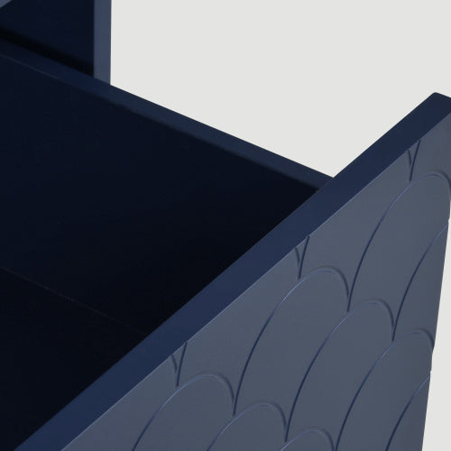 - Einzigartige Platte mit Fischschuppenmuster: Das marineblaue Fischschuppenmuster und die champagnerfarbenen Metallbeine verleihen diesem Schrank eine elegante Präsenz im Schlaf- und Wohnzimmer.Das Produkt ist mit hochwertigen Metallscharnieren ausgestattet, die es ermöglichen,die Abstände zwischen den Türen und Schubladen zu regulieren, wodurch die Platten ein kohärentes und ästhetisch ansprechenderes Fischschuppenmuster erhalten.