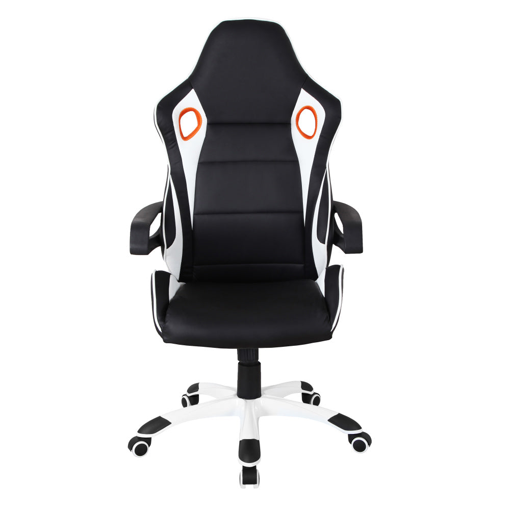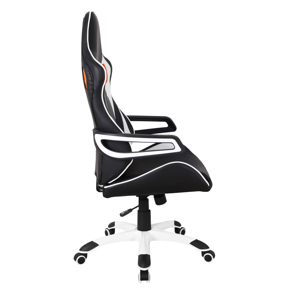 Get into the action with this streamlined professional Techni Mobili Racing Style Home & Office Chair. Built to emulate an ergonomic style, made with rich PU and segment padding provides lasting lumbar support to help you to focus into your work for longer hours. The tilt mechanism with tension control, pneumatic seat height adjustment with the practical swivel let you customize your work setup with maximum comfort. The durable and easy-to-clean surface features a striking black and white color scheme adding a dynamic look with fixed contoured armrests. The non-marking casters and durable 5-star nylon base ensures that your office chair work with you. Weight support up to 200 lbs.