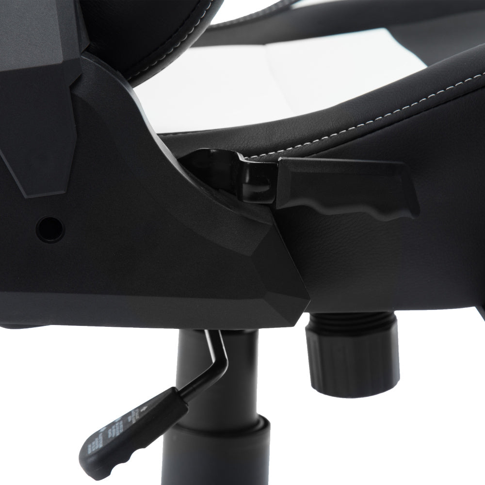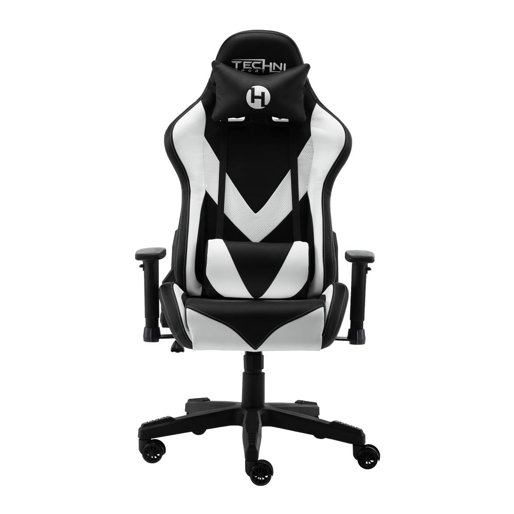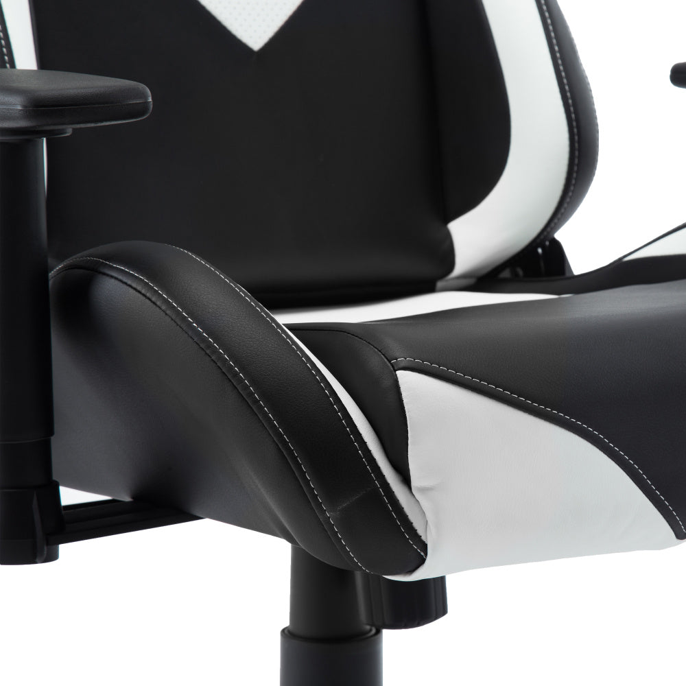 Add a classy touch to your gaming station with our white/black gaming chair. It is sturdy and comfortable, has durable nylon base and is well cushioned to support your back. This high back chair comes in two tone accents, outlining the curves of the chair. Made with rich and durable PU, contoured segment memory-foam padding, includes neck and lumbar support pillows, adjustable 2D padded armrests and the pneumatic seat height adjustments make its look complete. Features tilt with tension control and 150 degree reclining mechanism and a 5-star durable nylon base with non-marking casters allows you to glide with ease. This chair supports 250lbs of weight limit.
