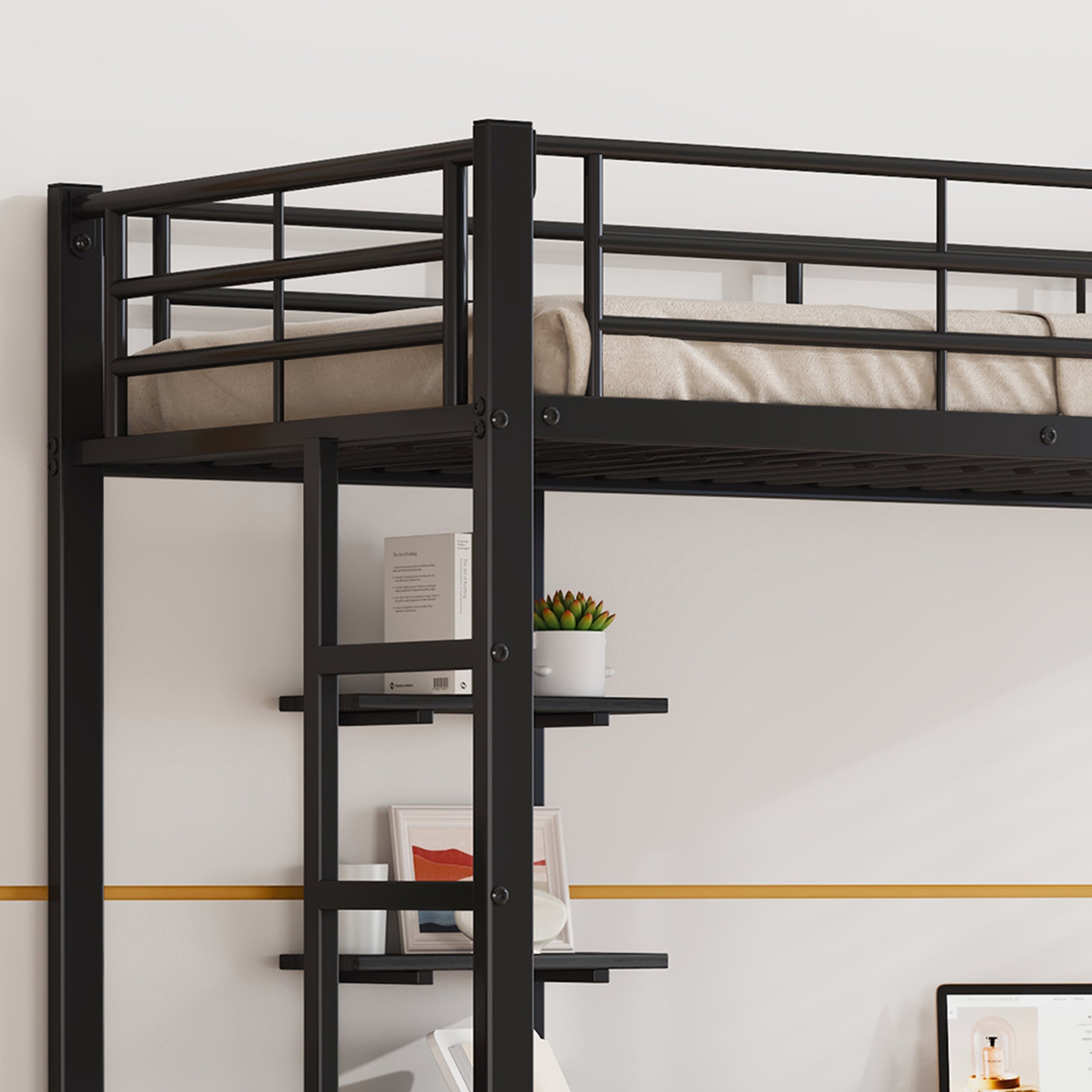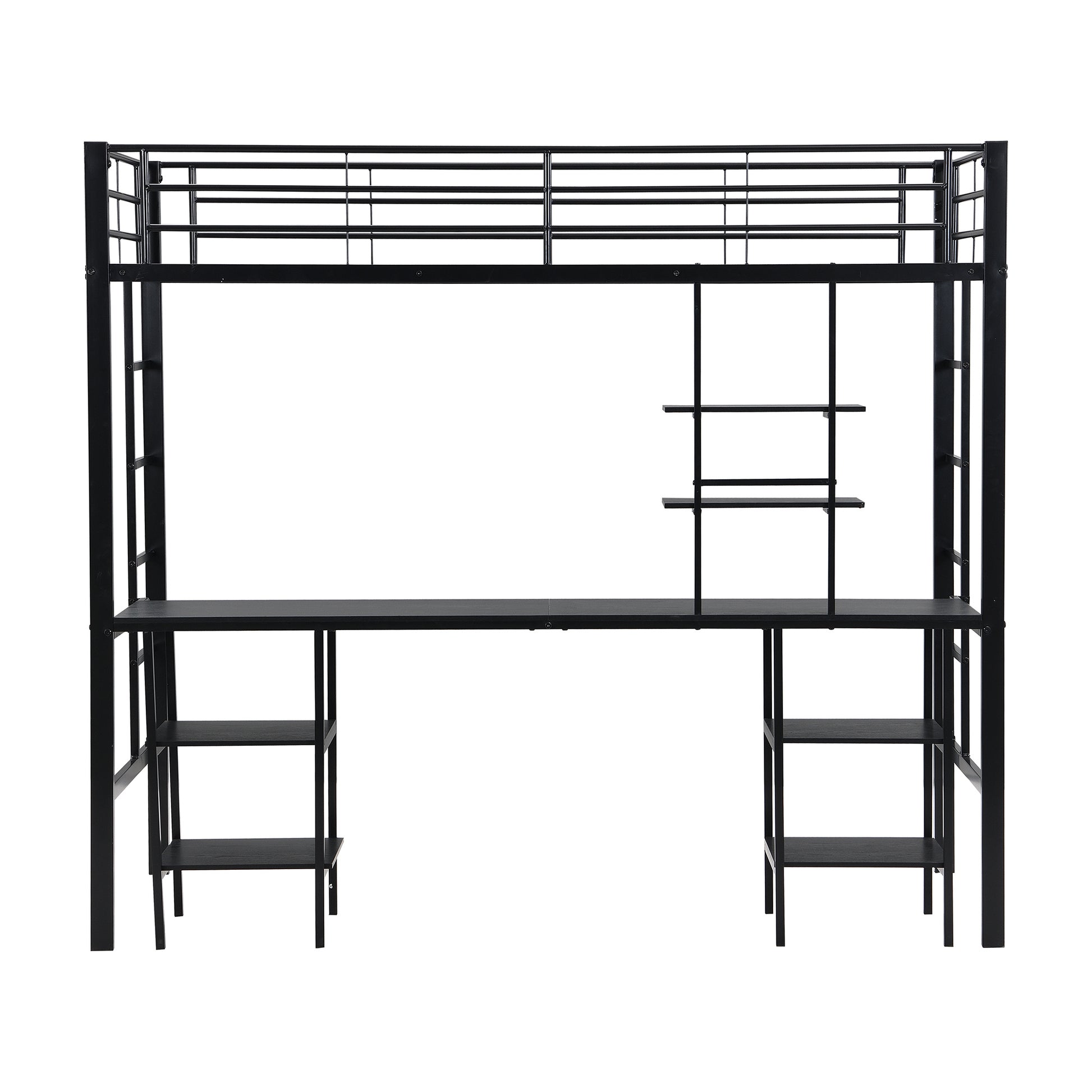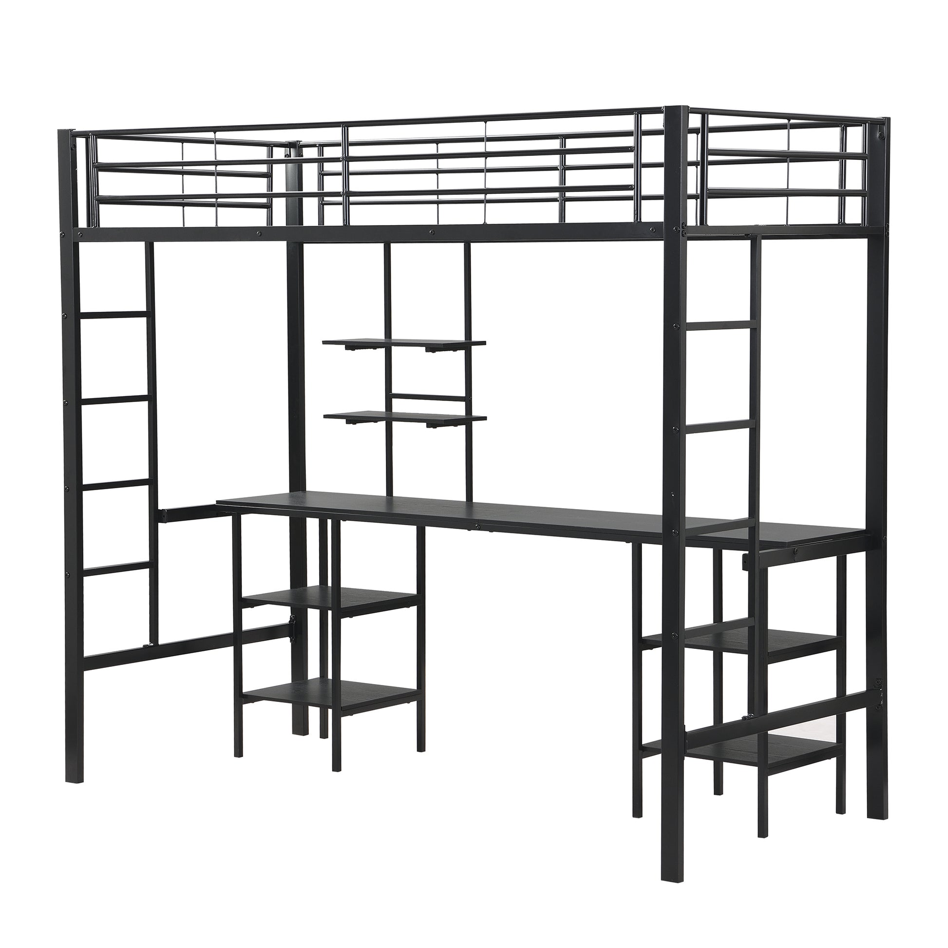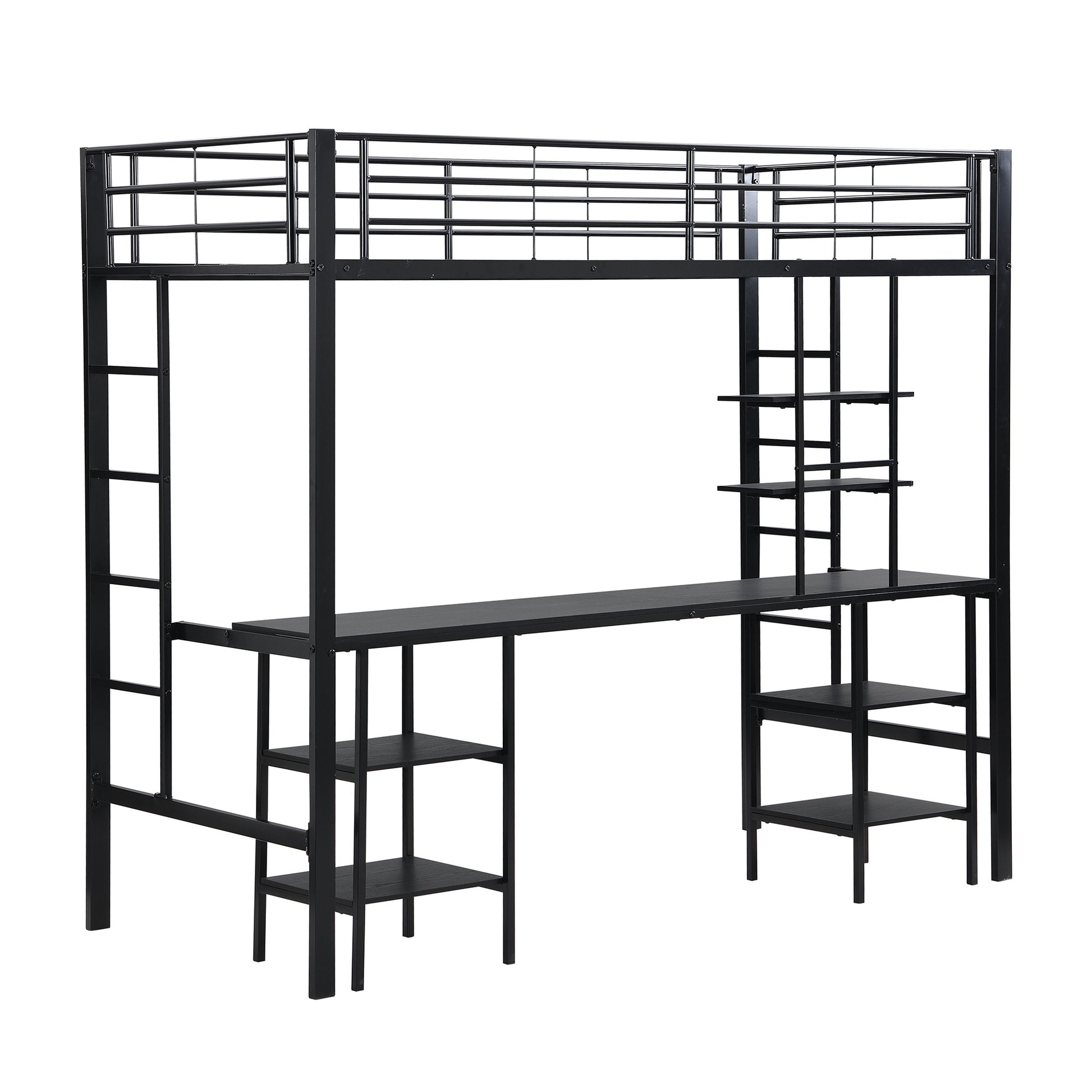 Eisenrahmenbett, Etagenbett mit Tisch und Regalen, mit Fallschutzgitter, Eisen + MDF, Schwarz,90x200