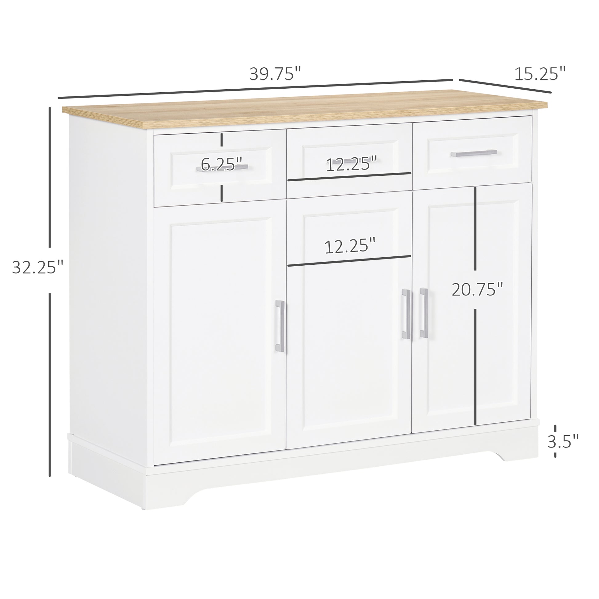 Quickly add that needed storage with triple drawers and plentiful cabinet space. The buffet table provides a versatile storage solution with an adjustable shelf in the right cabinet that suits your items of different heights. A wide undivided space can accommodate your lengthy belongings like pans and baking dishes. Bring this modern furniture home to keep your kitchen tidy and clean. Features: - Three drawers and two 2-tier cabinets for daily accessories and utensils - Right cabinet is equipped with a 3-level adjustable shelf to accommodate items of various heights - Anti-tipping design at the back is designed for safety - Painted and melamine-coated for protection that makes for easy cleaning - Assembly required Specification: - Color: White, Oak - Material: MDF, Particleboard - Overall Dimensions: 39.75" W x 15.25" D x 32.25" H - Drawer Inner Size: 10.25" W x 11" D x 3.5" H - Left Cabinet Shelf Inner Size: 12.25" W x 13" D x 10" H (left cabinet) - Right Cabinet Shelf Inner Size: 24.75" W x 13" D x 9.75"/10.25" H (in the middle hole) - Weight Capacity: 110 lbs. (whole), 11 lbs. (each shelf), 7 lbs. (each drawer) - Item Label: 835-896V00WT Package Includes: - 1 x Sideboard - 1 x Manual.